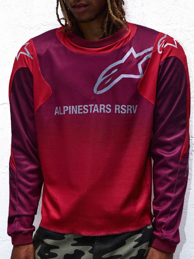 The Racer is another RSRV piece that started life as a deadstock MX jersey from the Alpinestars technical catalog. We reworked it with a ribbed collar and ribbed cuffs for casual comfort. We cropped the length to eliminate the elongated rear panel and give it a boxier fit. We also added the signature RSRV topstitch in a slash pattern across the left chest and an overlock hem at the waist for added detail.