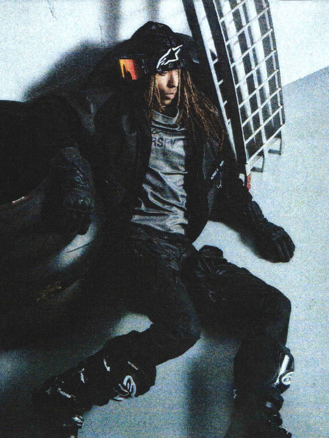 The Racer is another RSRV piece that started life as a deadstock MX jersey from the Alpinestars technical catalog. We reworked it with a ribbed collar and ribbed cuffs for casual comfort. We cropped the length to eliminate the elongated rear panel and give it a boxier fit. We also added the signature RSRV topstitch in a slash pattern across the left chest and an overlock hem at the waist for added detail.