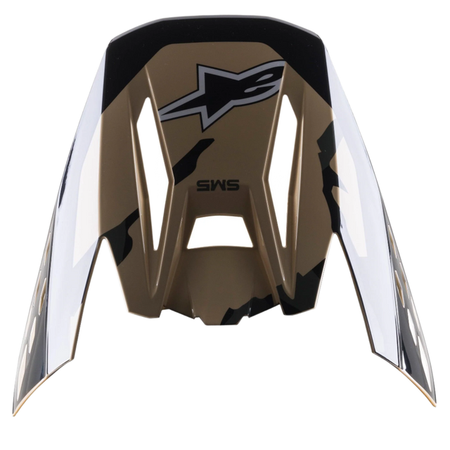 Visera Alpinestars S-M5 Rover, repuesto para casco de motocross, diseño de camuflaje arena y mandarina brillante, patrón de camuflaje en color arena y negro con acabado de alto brillo, incluye el logotipo de la estrella de Alpinestars y la marca SM5