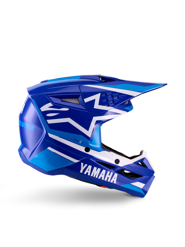 Alpinestars Yamaha S-M3 Youth Helmet ECE06, casco de motocross juvenil, azul y blanco, diseño angular con visera larga, certificado ECE06, acabado brillante con ventilación